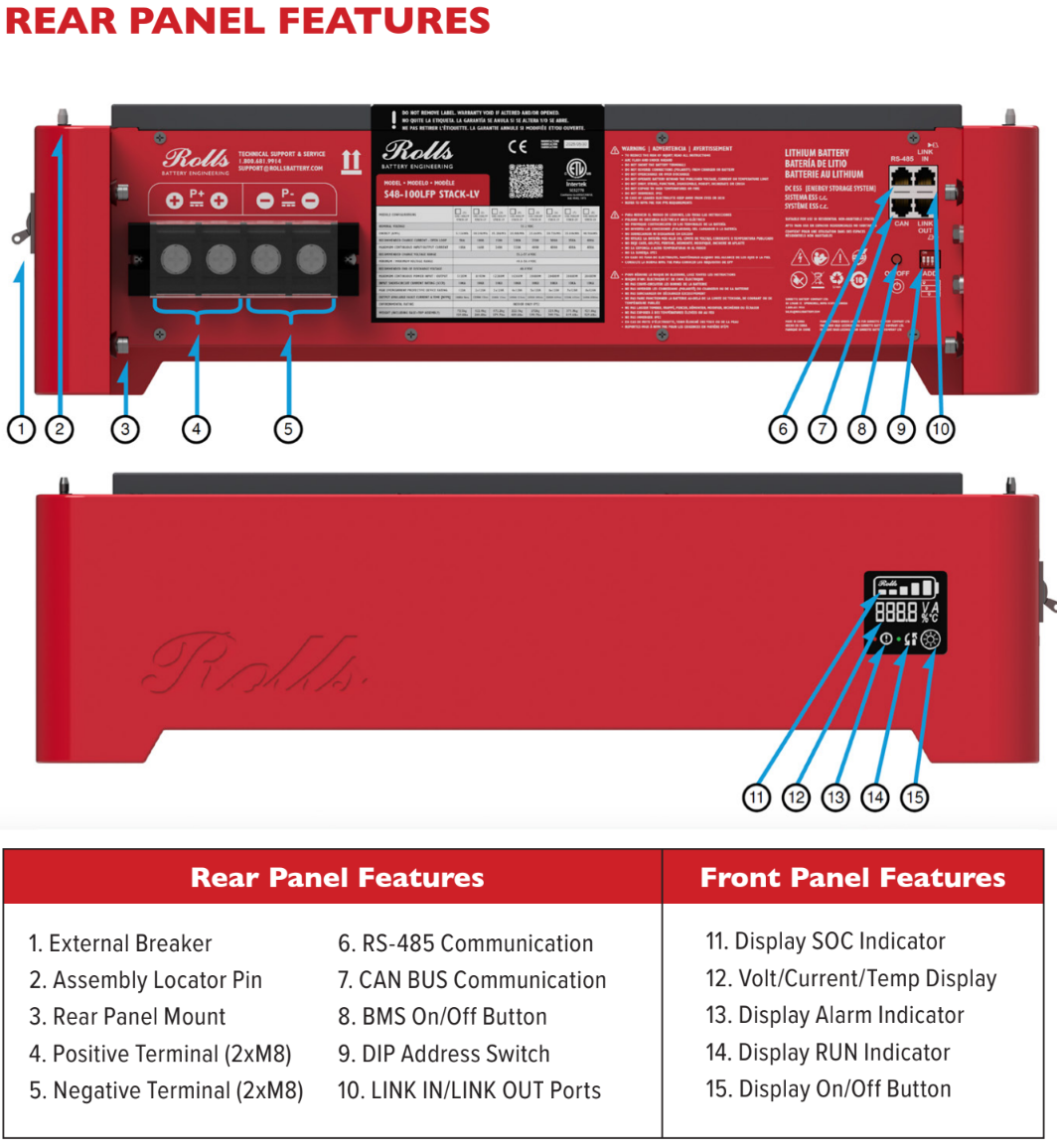 Rolls S48-100LFP STACK-LV series Energy Storage Systems (ESS) are a series of stackable ESS modules. These batteries are intended for installation in systems requiring between 5kWh and 40kWh of storage per DC system, with up to 400A (20kW) discharge capability. Larger systems above 40kWh storage should take advantage of AC coupling to combine ESS systems on the AC bus.