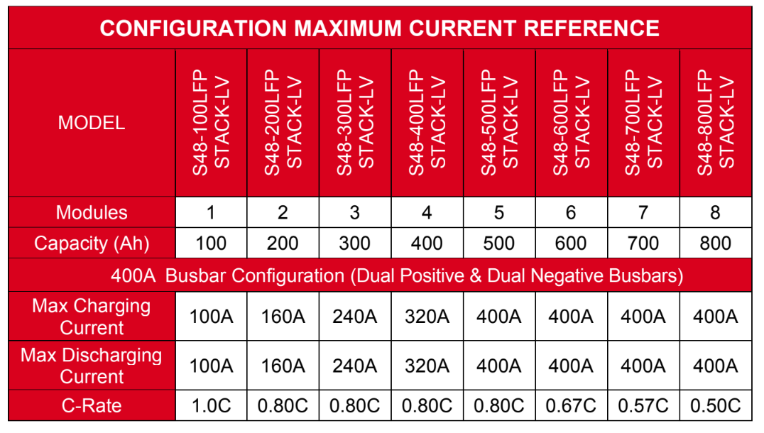 Note: Factory settings for current limits in closed loop communication are based on a 400A Busbar configuration (busbars are included in packaging). Each of the four terminals on the S48-100LFP STACK-LV module has a maximum current limit of 200A. For all installations, code compliance, and adherence to certifications, installation of the four (4) supplied busbars, connected on the two (2) positive terminals & two (2) negative terminals, per battery, is required (See installation instructions).