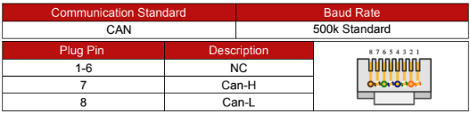 The CAN bus port pinout is shown below. See Appendix A or S48-100LFP STACK-LV Inverter Compatibility for compatible inverters.