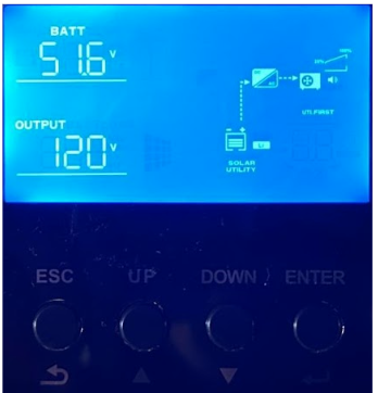 Push the DOWN button until the desired lowest battery SOC level before switch to utility when its available for grid-tied system, this will also be the battery shut down SOC level for Off-Grid systems.